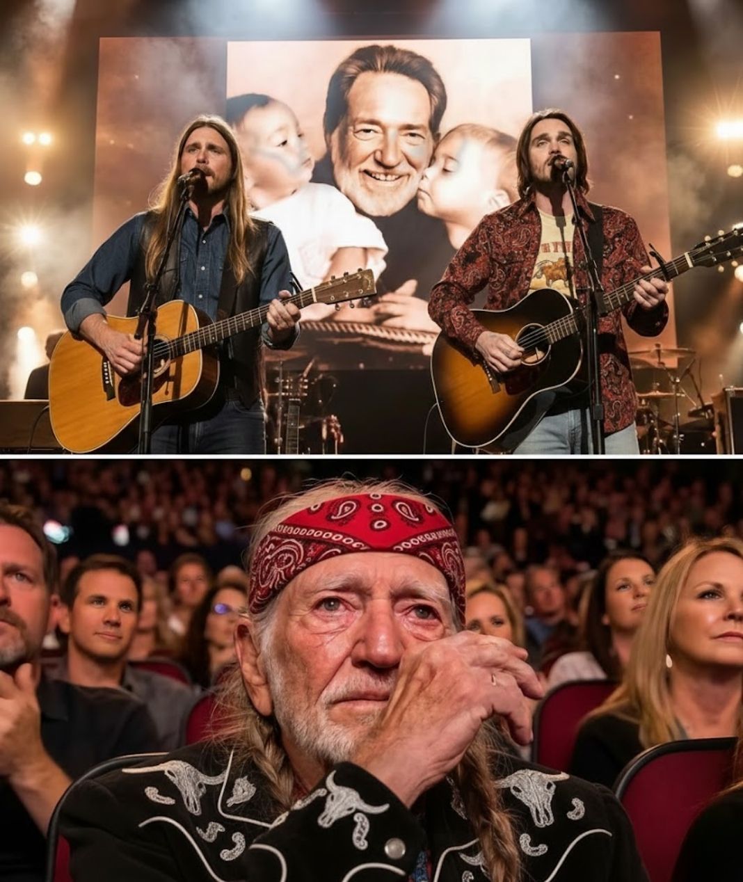 For decades, audiences have known Willie Nelson as a symbol of endurance and unmistakable artistry — the braids, the weathered guitar, the unmistakable phrasing that bends time itself. Yet on this evening, he stood not as an icon, but as a father. As the harmonies rose and wrapped around him, his composure faltered. His eyes glistened. His expression softened in a way cameras rarely capture.