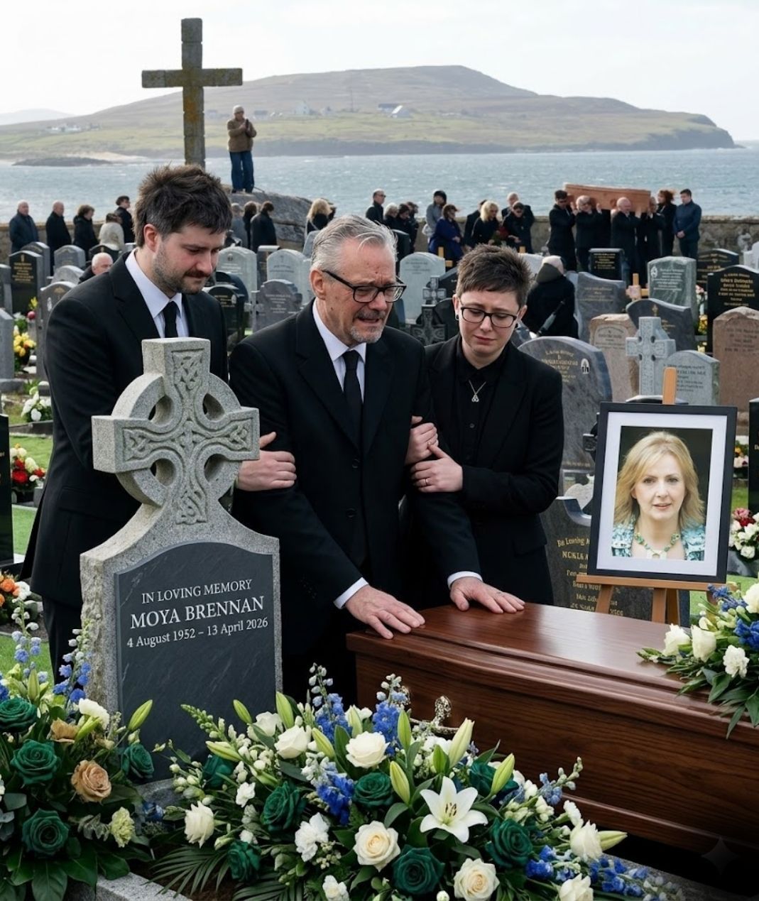 When the final moments came to lay Moya Brennan to rest, the cemetery stood wrapped in a quiet that felt almost unbearable. The air was still, the sky unmoving, and those gathered seemed held in a fragile pause between memory and farewell. It was a moment where nothing could be rushed, where every second carried the weight of a life that had meant so much to so many.