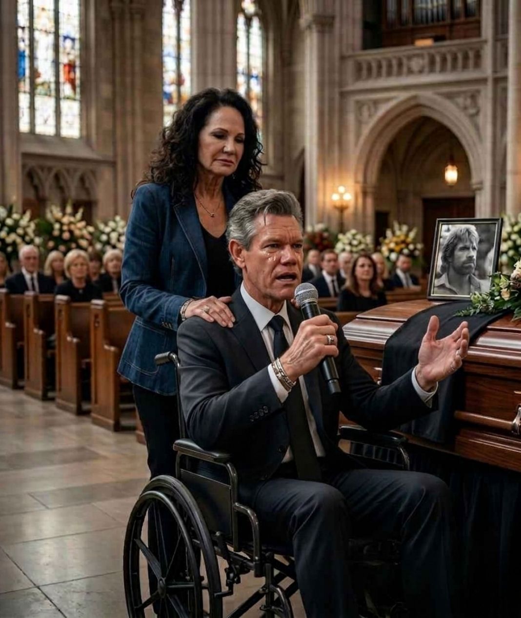 In a scene that left everyone holding their breath, Randy Travis, at 66, made the courageous journey to the funeral of his longtime friend Chuck Norris, despite being unsteady on his feet and confined to a wheelchair. The air was thick with grief and solemnity as family, friends, and fans gathered to pay their respects to the legendary icon. The moment Randy approached the coffin, the room seemed to fall silent, the chatter of the crowd replaced by a profound, shared stillness that no one dared to break.