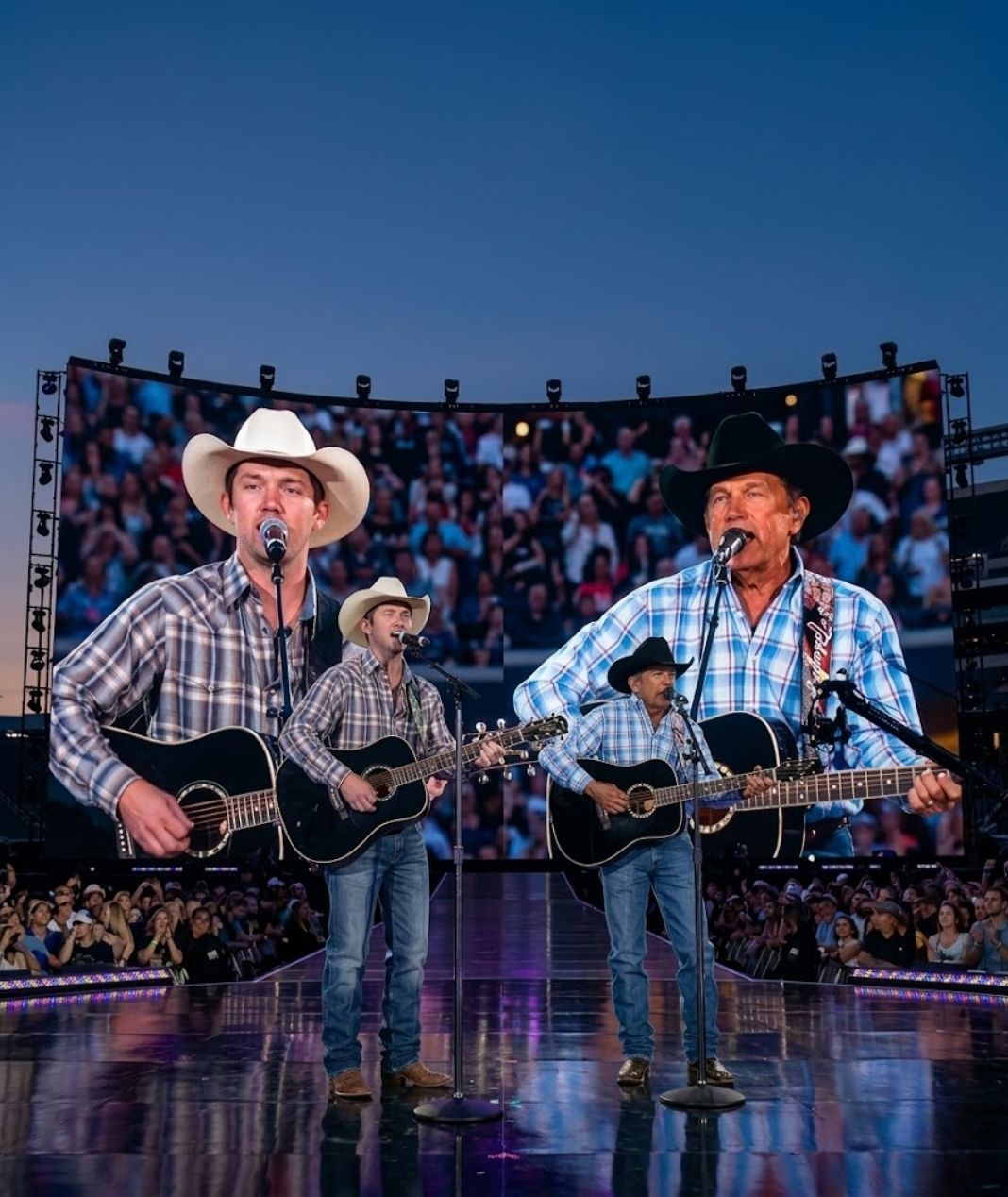 As the music begins and George Strait sings the opening lines, the crowd settles into a respectful hush. The sound of his voice—steady, warm, and unmistakable—fills the venue just as it has for generations of fans. Beside him, Bubba Strait joins in, and for a brief moment the vast stage feels almost like a family living room where songs have been shared for years.