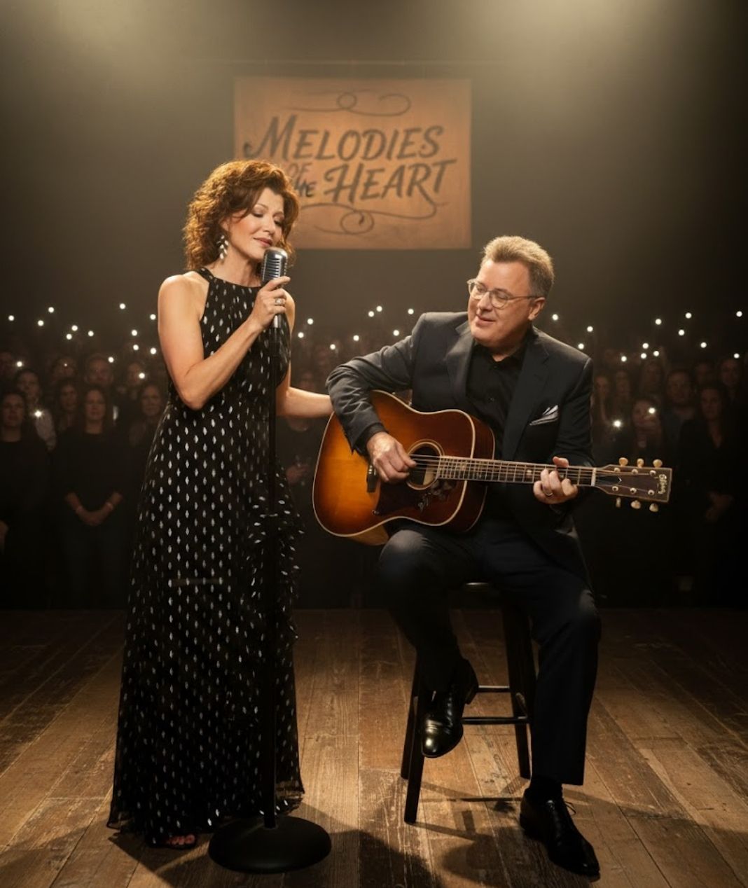 Amy Grant began the song with a calm assurance, her voice steady and familiar, carrying the warmth of someone who has sung to millions yet still sounds as though she is singing to one heart at a time. Vince Gill joined her not as a featured star but as a partner in sound and spirit. His guitar lines were clean and restrained, never competing with the moment, only supporting it. Together, they allowed the song to breathe.