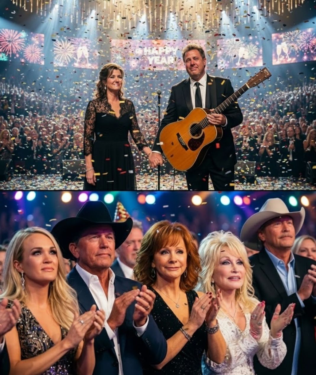 As the countdown clock continues its silent march toward midnight, their voices rise together, blending with a tenderness that immediately quiets the arena. The room — filled with country legends, musicians, and lifelong fans — seems to exhale all at once. Conversations stop. Applause waits. What takes over instead is attention, the kind reserved for moments people instinctively know will not come again.