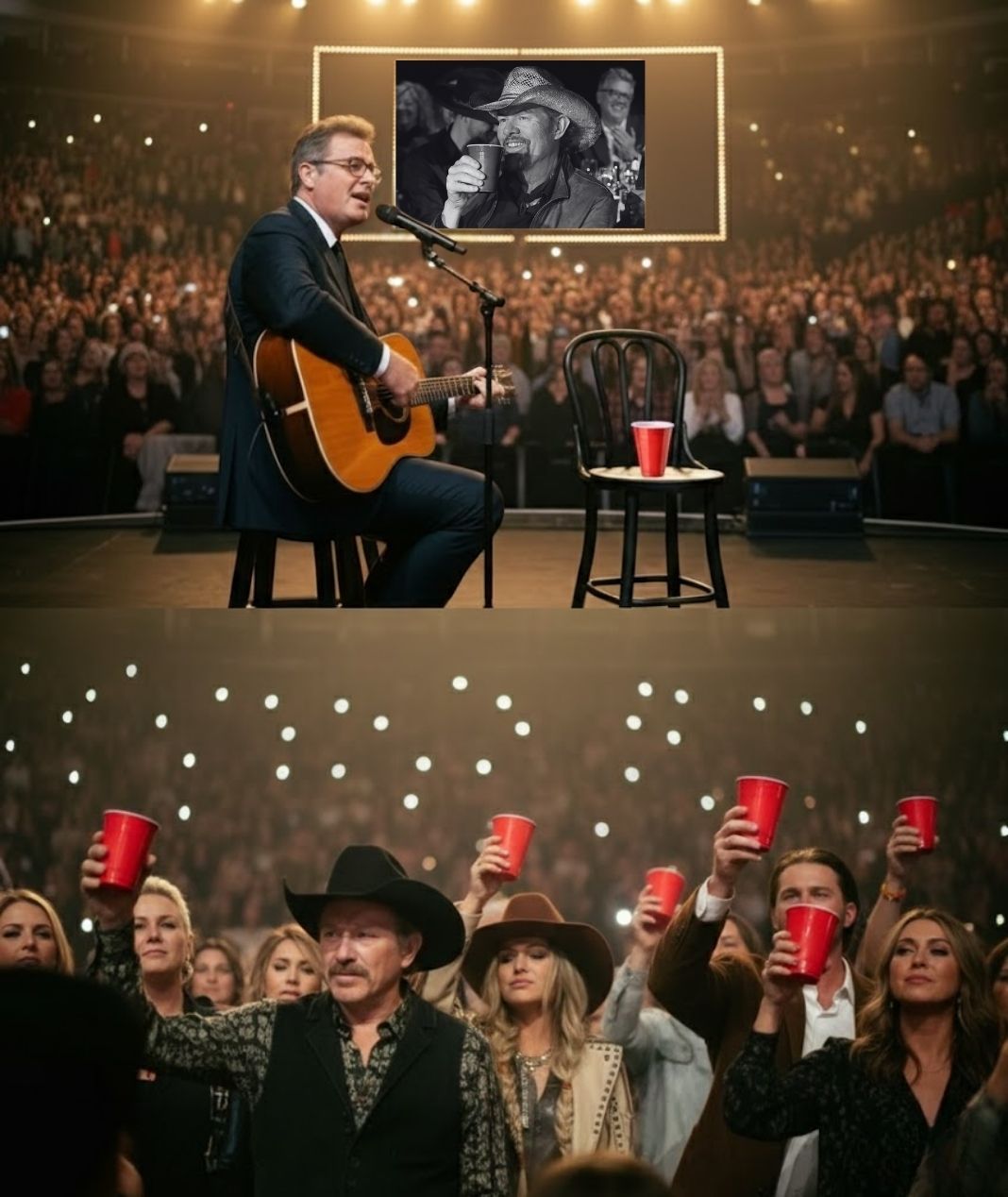 There are moments in music history when a performance stops being entertainment and becomes something far deeper — a communal farewell, a shared breath, a sacred pause in time. That is exactly what happened in Tulsa when Vince Gill stepped onto the stage at All For The Hall, carrying with him not just a guitar, but the weight of loss, memory, and respect, to honor Toby Keith. What followed was not planned to dazzle. It was meant to heal.