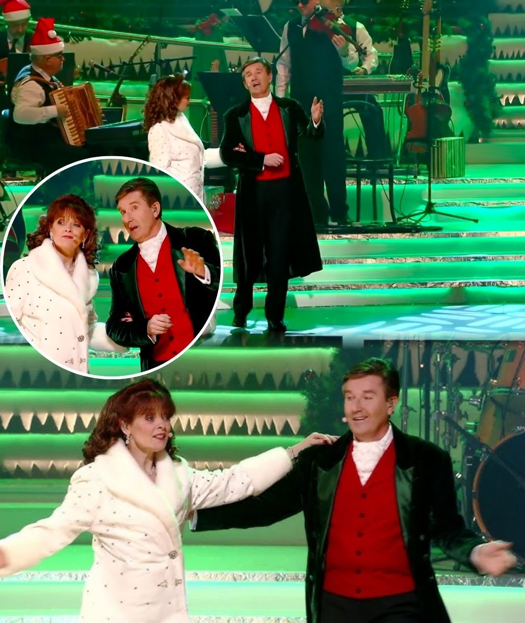 As the performance continues, Daniel takes a verse with a wink in his voice, singing with a playful tone that makes the audience laugh and smile. Mary responds with equal charm, adding her own festive sparkle. Their interplay is lighthearted and sweet, capturing the carefree joy of the season without ever feeling forced.