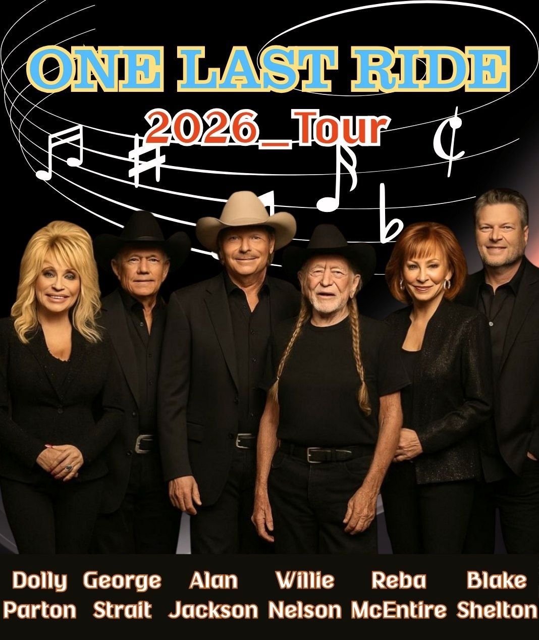 Nashville, Tennessee — In what is being hailed as the greatest event in country music history, six of America’s most beloved legends — Dolly Parton, George Strait, Alan Jackson, Willie Nelson, Reba McEntire, and Blake Shelton — will join forces for a once-in-a-lifetime farewell: the “One Last Ride” Tour 2026.