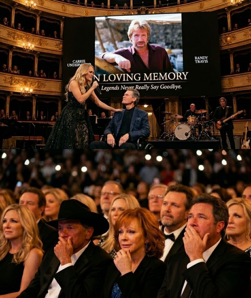 There are moments in music when the stage becomes more than a place for performance — it becomes a place for memory, respect, and goodbye. That was exactly what happened when Randy Travis and Carrie Underwood came together for a quiet and deeply emotional tribute to Chuck Norris, a man whose name meant strength, resilience, and inspiration to millions of people around the world.