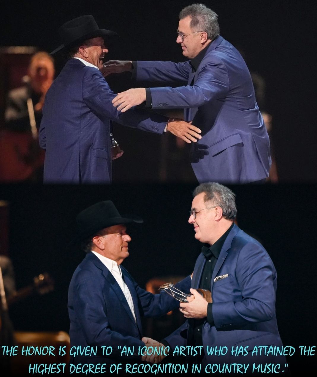 George went on to deliver a tribute that felt less like a speech and more like a love letter — not only to Vince’s achievements, but to the soul of country music itself. He spoke of Vince’s unmatched musicianship, his unmistakable tenor voice, his kindness backstage, his mentorship to younger artists, and his remarkable ability to write songs that “cut straight to the heart.”