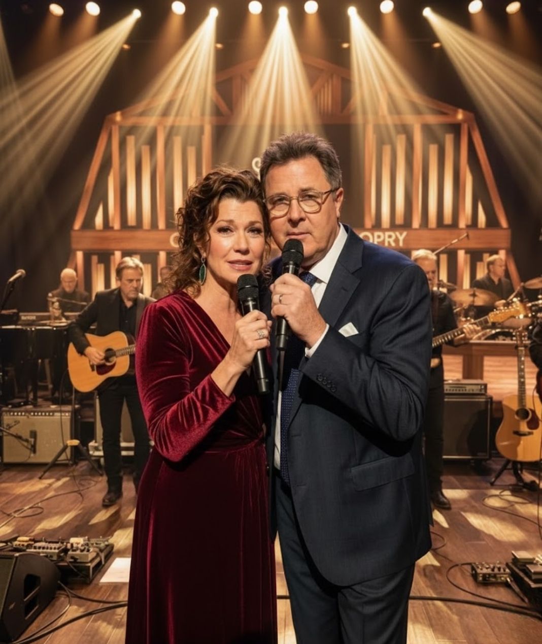 On a night already heavy with expectation, the Grand Ole Opry became something more than a legendary stage. It became a place of shared breath, shared memory, and shared devotion, as Vince Gill stepped forward onto the sacred Opry circle and gently drew Amy Grant close. What followed was not planned to overwhelm, yet it did exactly that — not through force, but through quiet truth. Longtime listeners sensed it immediately. This was not a performance chasing applause. This was a moment unfolding with purpose.