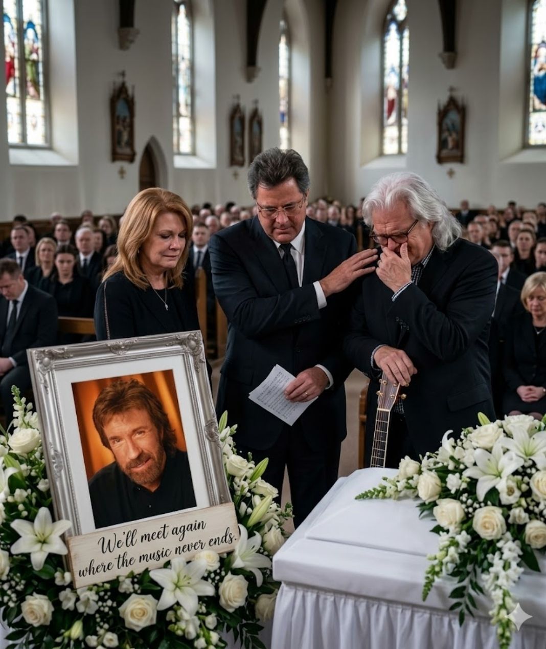 The funeral of Chuck Norris was expected to be solemn, respectful, and quiet — a gathering of family, friends, and a few close figures whose lives had crossed paths with a man known around the world for strength and discipline. The room was filled with flowers, soft light, and the low murmur of people sharing memories in hushed voices. It was a day of reflection, not performance, and certainly no one expected what would happen near the end of the service.