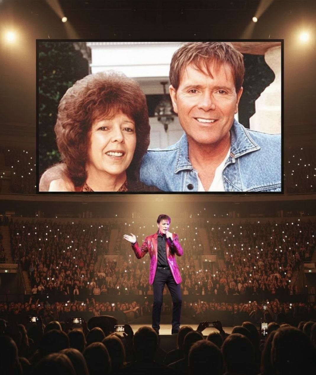 Midway through the performance, as the lights shifted and the atmosphere softened, a large image appeared on the venue’s LED screen. It was not a dramatic visual effect or a montage of career highlights. It was a photograph tied to family memory, and its presence immediately changed the air in the room. Those closest to the stage noticed Sir Cliff pause. Not for effect. Not for timing. But because something real had reached him.